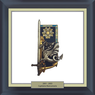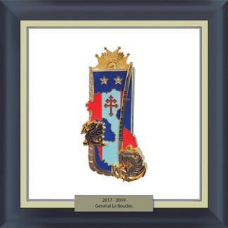 En 2020, nous proposons au lieutenant-colonel L, commandant l’Ecole militaire interarmes (EMIA) de réaliser un mur des promotions. Il s’agit de réaliser un ensemble de panneaux en créant un modèle de cadre en trompe l’œil et d’y imprimer la photo de chaque insigne depuis la création de l’Ecole en 1961. En janvier 2021, l’ensemble du mur est réalisé.